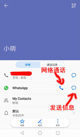 选择whatsapp标识联系人,点击信息或者通话按钮,进行一次信息发送或者语音通话,对方被自动添加到对话界面(好友)。